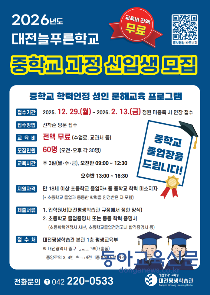 [종합>사회] 중학교 학력 무료로 취득…대전늘푸른학교 신입생 모집 2026-01-06 21:36:57 |